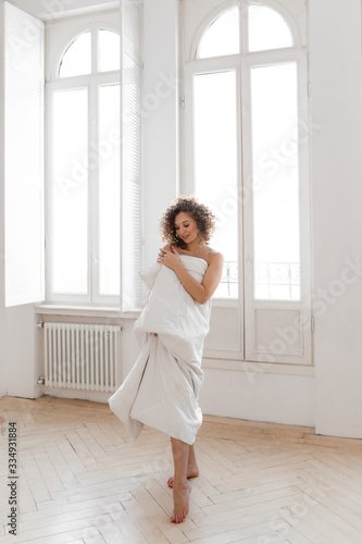 Beautiful sweet cheerful tender happy natural sleepy girl with Afro curls wrapped in a blanket wakes up and enjoys the morning looks out the window against the background of large vintage Windows