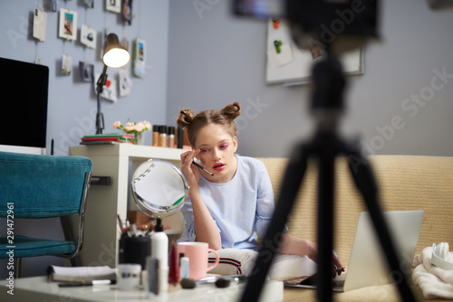 Beautiful teen girl recording video blog at home