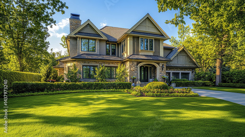 beautiful three story home with traditional architecture surrounded by lush greenery