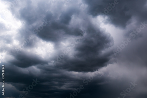Beautiful thunderclouds. Beautiful dramatic blue sky background with fluffy dark clouds. Rainy weather.