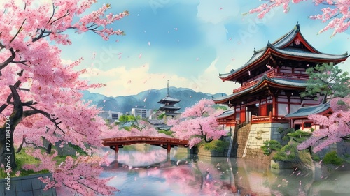 Beautiful traditional Japanese landscape featuring cherry blossoms, a pond, and historic architecture in serene spring setting