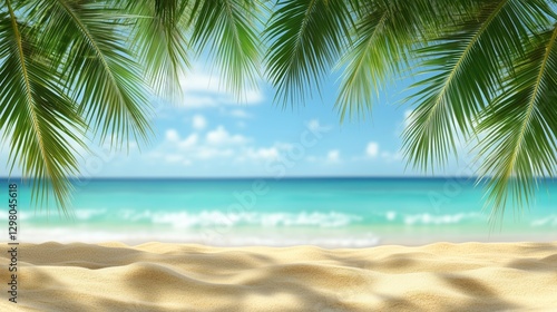 Beautiful tropical beach with palm trees, golden sand, calming waves, bright sky, and serene atmosphere on a sunny day near the ocean