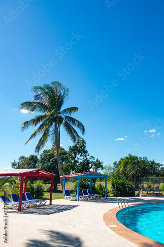 Beautiful tropical resort with swimming pool, sun-loungers and palm trees during a warm sunny day, vacations in Cuba