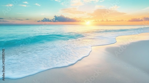 Beautiful turquoise waters gently lapping onto a white sandy beach, with a colorful sunrise painting the sky, creating a tranquil coastal scene
