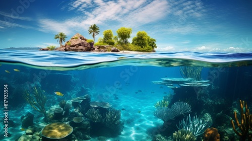 Beautiful underwater view of lone small island above and below the water surface in turquoise waters of tropical ocean.