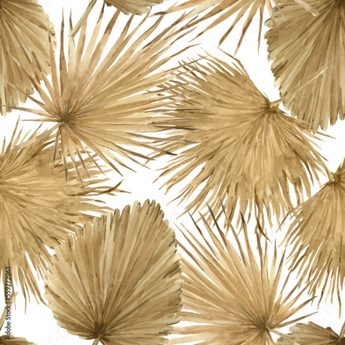 Beautiful vector autotraced tropical seamless pattern with watercolor hand drawn golden palm leaves. Stock illustration.