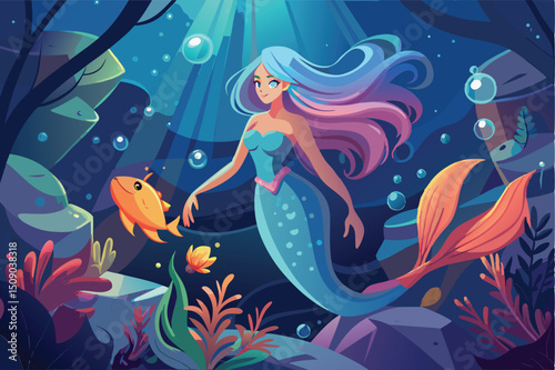 Beautiful vector illustration of a mermaid woman dancing in the magical night sea with colorful fish