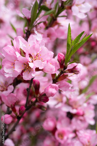 beautiful vibrant pink flowers of almond tree at sunny day. macro natural floral seasonal background