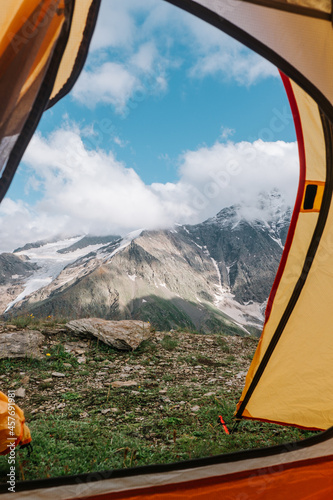 Beautiful view from the tent to the outdoor mountains on a sunny warm morning in the highlands