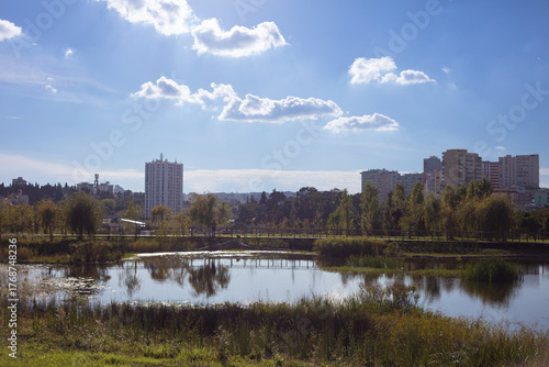 Beautiful view of a natural lake surrounded by trees and vegetation with a wooden walkway in Parque Verde, Lisbon, Portugal. Peaceful urban park landscape with reflections on the water
