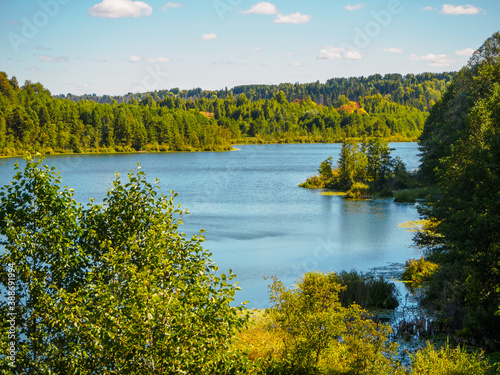 Beautiful view of forest lake Puzhanier in sunny summer day.