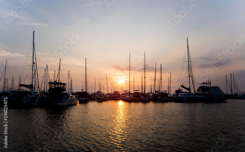 Beautiful view of marina and harbor with yachts and motorboats. Sunset at the ocean.