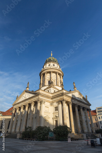 Beautiful view of the Französischer Dom (French Cathedral) at the Gendarmenmarkt Square in Berlin, Germany, on a sunny morning. Copy space.