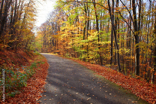 Beautiful vivid color autumn landscape in a forest with a road and fallen leaves