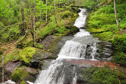 Beautiful waterfall in green forest in jungle. Jungle landscape with flowing red water of waterfall at deep tropical rain forest. National Park Old Mountain, Serbia