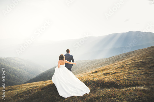 Beautiful wedding couple posing on top of a mountain at sunset