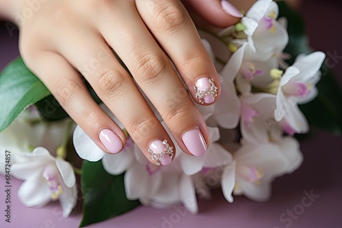 Beautiful well-groomed hands of the bride with modern manicure, nail design for the bride