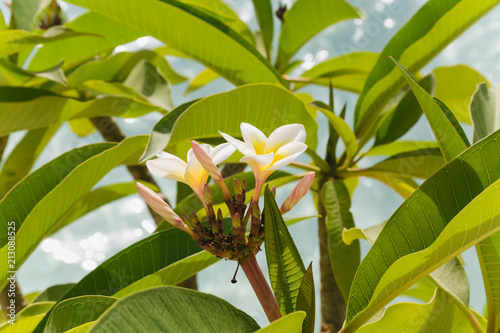 Beautiful white and yellow flowers and green leaves of plumeria tree isolated at blurry blue water of swimming pool background. Horizontal color photo.