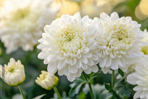 Beautiful white chrysanthemum flowers in the garden with a green grass meadow background at sunset.