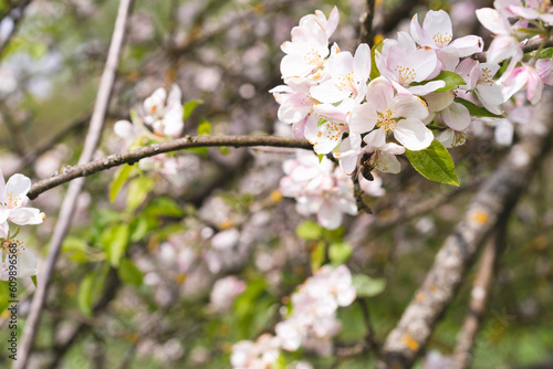 Beautiful white flowers on a branch of an apple tree against the background of a blurred garden. Apple tree blossom. Spring background