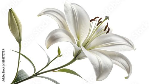Beautiful white lily flower in full bloom with a closed bud offering visual elegance and artistic representation.