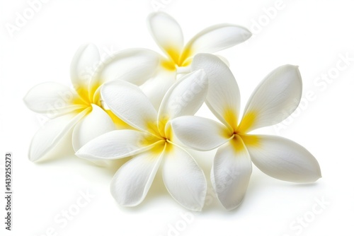 Beautiful white plumeria flowers with yellow accents arranged artistically on a white background