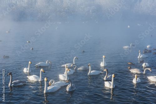 Beautiful white whooping swans swimming in the nonfreezing winter lake. The place of wintering of swans, Altay, Siberia, Russia.