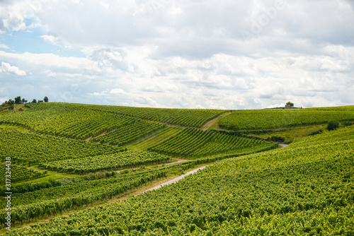 Beautiful wineries in the summer season of western Germany, visible road between rows of grapes.