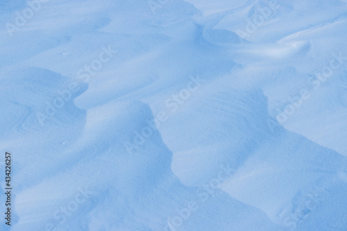 Beautiful winter background with snowy ground. Natural snow texture. Wind sculpted patterns on snow surface.