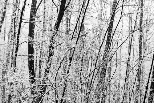Beautiful winter landscape in the european forest. Snow on the trees. Enigmatic and amazing winter nature in black and white. Frosted trees branches.