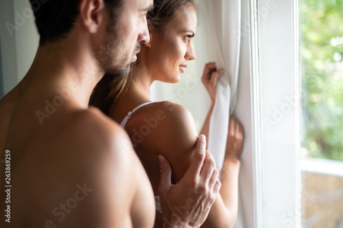 Beautiful woman and handsome muscular man close to each other in erotic pose.