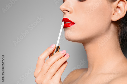Beautiful woman applying red gloss on lips against gray background, closeup. Space for text