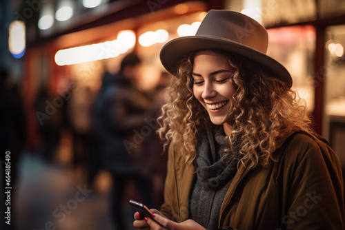 Beautiful woman as she smiles while gazing at her mobile phone, reflecting the joy of modern connectivity and communication. Ai generated