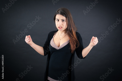 Beautiful woman doing different expressions in different sets of clothes: angry