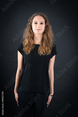 Beautiful woman doing different expressions in different sets of clothes: at attention
