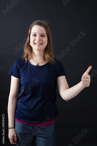 Beautiful woman doing different expressions in different sets of clothes: thumbs up