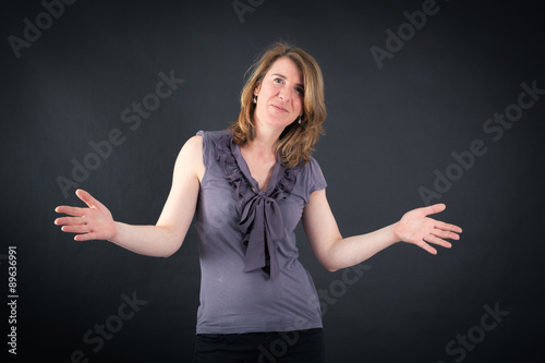 Beautiful woman doing different expressions in different sets of clothes: welcome