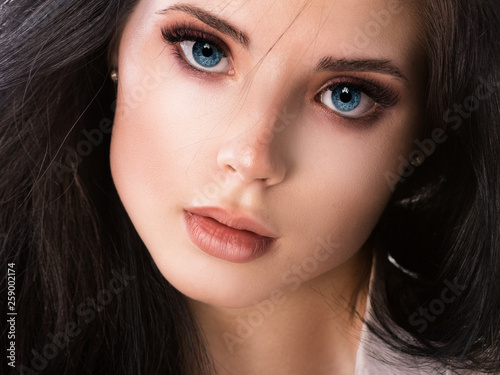 Beautiful woman face close up studio on white.