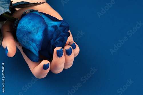 Beautiful woman hands with manicure holding roses against classic blue background