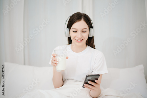 Beautiful woman has woken up on a white bed and holding coffee in the morning at home in morning