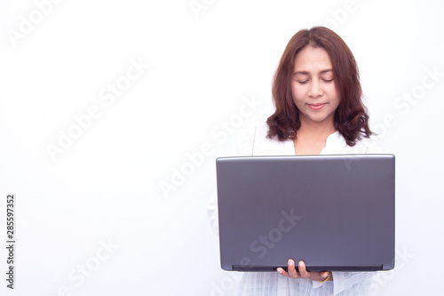 Beautiful woman holding a laptop while posing against a white background