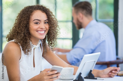 Beautiful woman holding on mobile phone in a restaurant