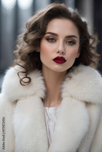 Beautiful Woman in a White Sweater and White Fur Coat with Dark Red Lips
