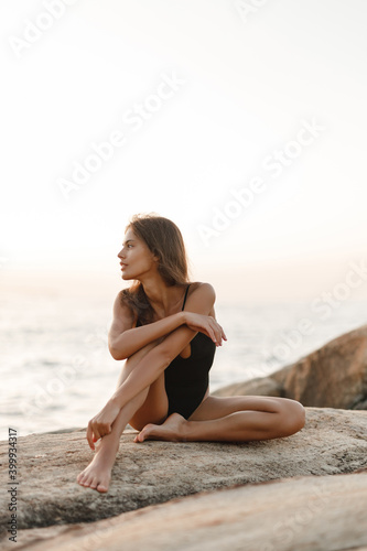 Beautiful woman in black swimsuit posing on the beach sitting on rocks, ocean view landscape