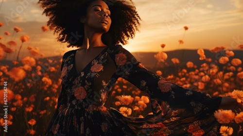 Beautiful woman in dress standing with arms outstretched in flower field at sunset generative ai