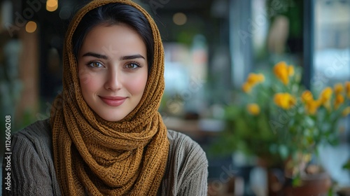 Beautiful Woman in Mustard Knit Scarf Portrait Closeup