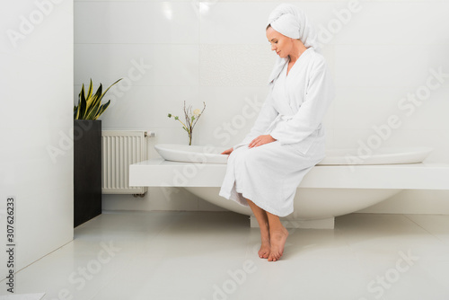 beautiful woman in white bathrobe sitting in modern bathroom