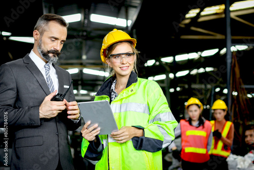 Beautiful woman industrial engineer worker wearing safely helmet and protective clothing, holding tablet and discussing with her senior businessman manager, at heavy industry manufacturing factory