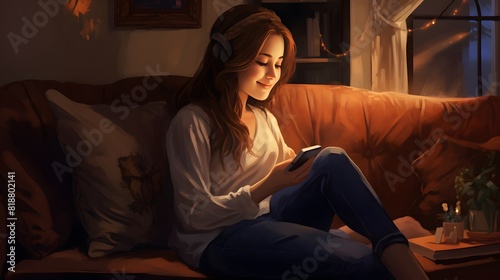 Beautiful woman is sitting on the sofa, holding her phone. Generative AI.
