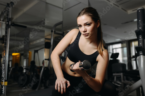 Beautiful woman lifting dumbbell in gym. She training biceps.